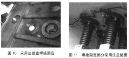 (3)穿墻套管與開關(guān)柜底板密封固定部位選用法蘭盤焊接固定安裝,如圖10所示,保證穿墻套管與開關(guān)柜底板接觸部分平坦無變形。一同螺栓固定部分選用法蘭墊圈,如圖11所示,保證了螺栓緊固力均勻效果于穿墻套管,然后消除了穿墻套管密封固定時的不均勻固定應(yīng)力。