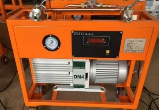 4)最有用最專業的辦法,是SF6抽真空補氣設備,單級旋片泵極限真空度可以抵達10Pa,雙級旋片泵理論極限真空度可抵達6.2*10-4pa,可是流量不大于100m3/h;